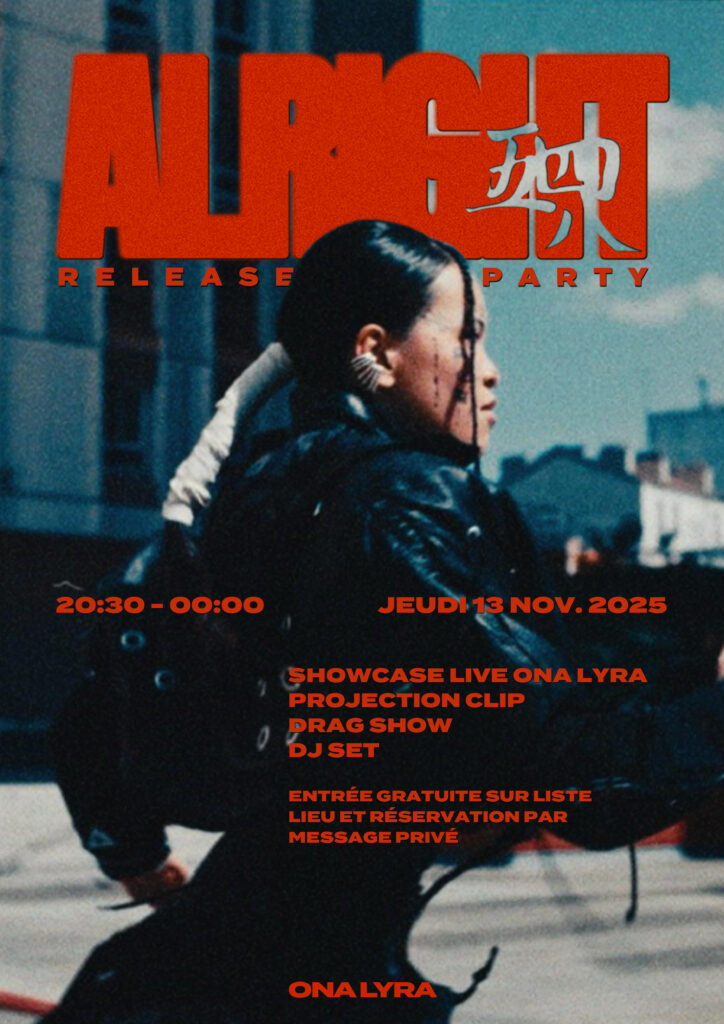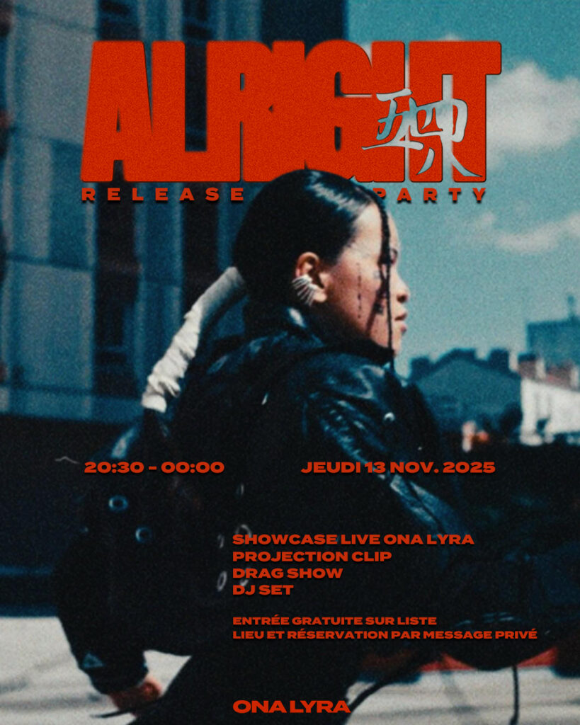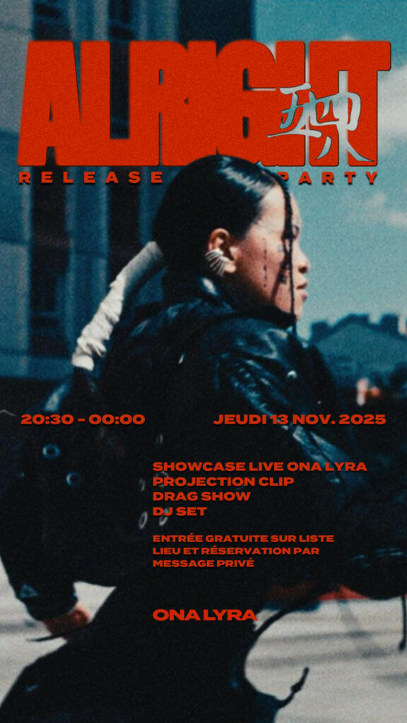 J’ai accompagné Ona Lyra dans la direction artistique de son morceau ALRIGHT, en travaillant le son, les arrangements et l’équilibre émotionnel global du titre. J’ai voulu préserver sa sincérité, sa fragilité maîtrisée et la dimension introspective de son écriture. Le clip prolonge cette intention : une esthétique minimaliste, intime et authentique, centrée sur la présence brute de l’artiste et sur la force de ses émotions plutôt que sur l’artifice. Mon rôle a été de guider cette cohérence entre musique et image afin que chaque élément respire et serve le propos. J’ai également conçu le flyer de la release party, et l’ai décliner pour un post Instagram, une story sur la même plateforme et une impression format A3.
